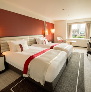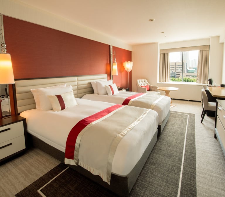 A room with two twin beds