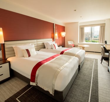 A room with two twin beds